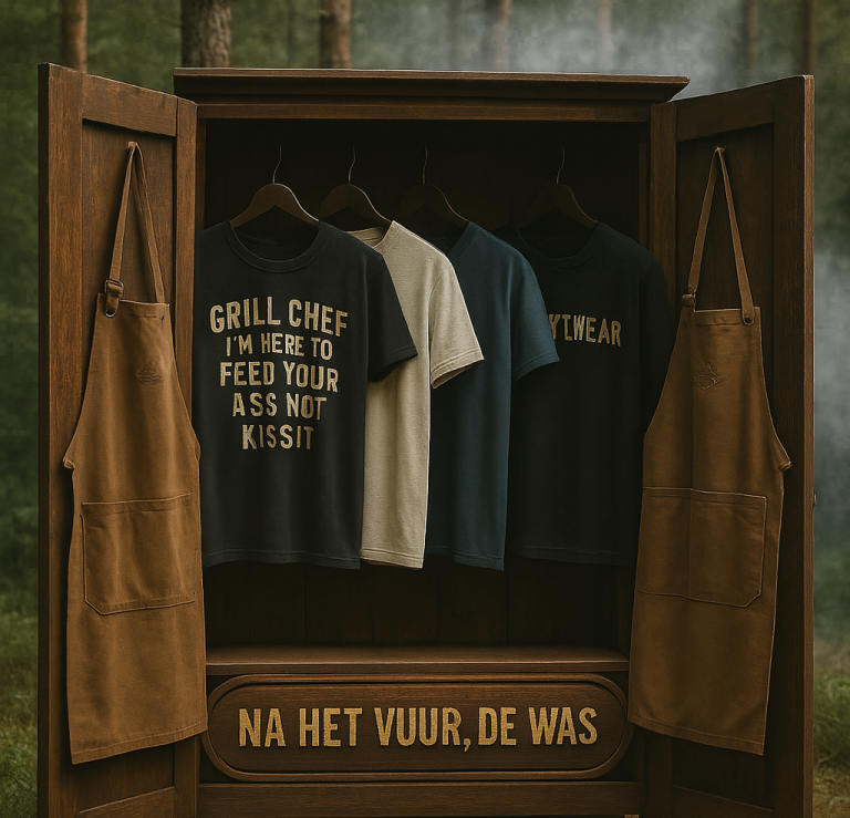 Wij brengen vuur, rook en karakter naar de kleding die je draagt. Geen fast fashion, maar shirts en schorten die je met trots draagt - aan het spit of in de kroeg.